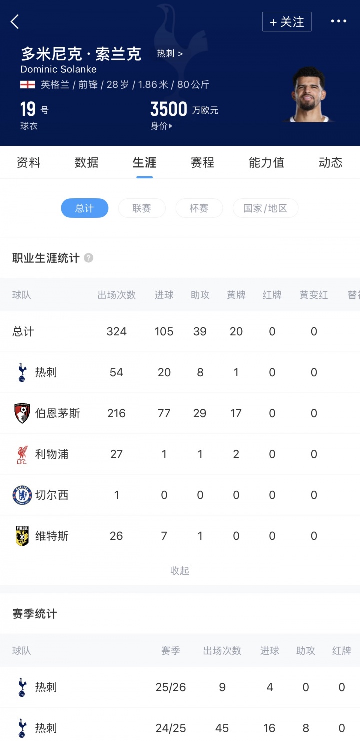 索兰克目前的身价为3500万欧元,2024年夏窗加盟热刺时的转会费高达6430万欧元。本周一,索兰克代表热刺首发出场,包办了对阵曼城的两粒进球。